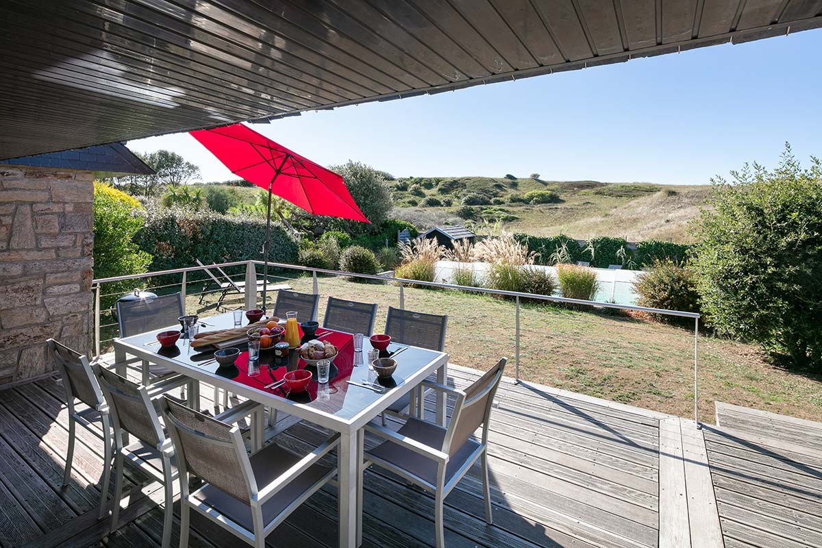 Terrasse bois vu sur les dunes avec mobilier d'extérieur : chaises longues, barbecue, un parasol, salon de jardin , douche extérieure. Piscine de 3,5 x 7 m profondeur maxi de 1,60 m, chauffée 28°C de mars à mi octobre , couverte pouvant être découverte totalement. Sécurité assurée par une fermeture à clé de l'abri de piscine.