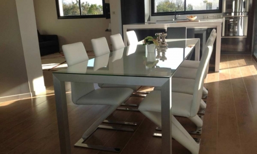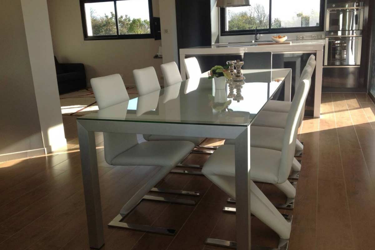Le rez de chaussée comprend un vaste sejour, salle à manger 10 couverts sur une cuisine ouverte avec un ilôt et des équipements Smeg (micro ondes, four, plaque de cuisson, lave vaisselle, réfrigérateur et congélateur), 1 salle télévision (console Wii) avec un canapé convertible de qualité pour 2 personnes et un sauna 2 personnes.