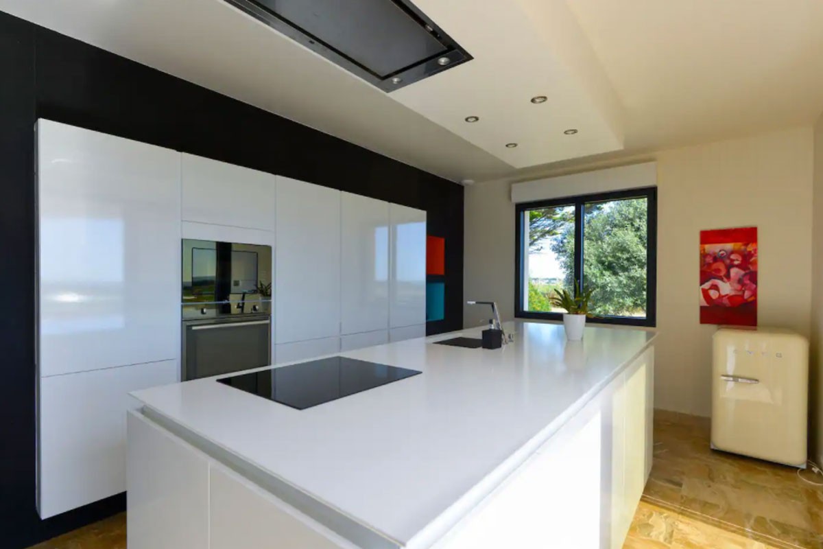 Le rez de chaussée comprend un vaste séjour, salle à manger sur une cuisine ouverte avec un ilôt et des équipements (micro ondes, four, plaque de cuisson, lave vaisselle, réfrigérateur et congélateur), . La pièce de vie donne sur 2 terrasses avec barbecue, un parasol, salon de jardin. Vue mer de toutes les pièces. Deux chambres avec vue mer (lit 160 cm) se trouvent également au rez de chaussée. 1 salle de bain avec baignoire et vasque, 1 wc indépendant.