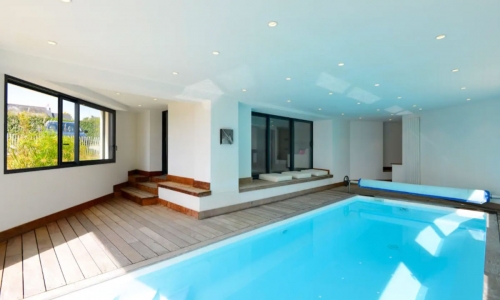 La piscine intérieure se situe au niveau du jardin , donnant sur une terrasse extérieure avec mobilier de jardin. Piscine intérieure 3 x 7 m profondeur maxi de 1,60 m, chauffée à 28°C toute l'année.