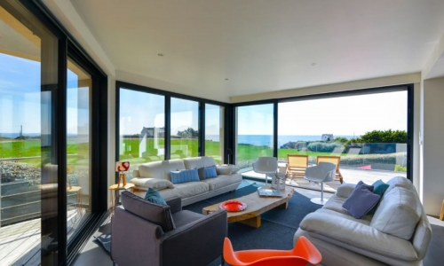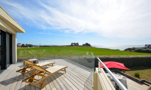 Maison 5 chambres totalement rénovée. Idéalement située face à la mer à 100 m de la plage, très calme, décoration contemporaine, tout confort, piscine intérieure chauffée et sécurisée, plage de sable fin à 100 mètres , côte sauvage, terrain tennis et club nautique à proximité (500 m), cuisine américaine. 5 chambres. jardin clos de 3500 m2, plusieurs places pour véhicules. Piscine totalement sécurisée.Maison très agréable à vivre avec superbe vue. 250 m 2 sans vis à vis. 3 terrasses Vue mer 180 °